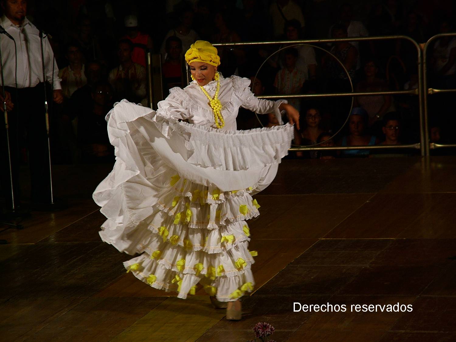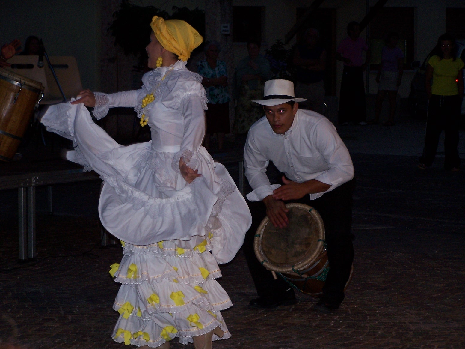 Un ejemplo excelente es la canción, titulada Yenyeré, del álbum "Raíces" producido por el Banco Popular en 2001. En una secuencia elaborada, típicamente uno de los bailadores se acercará a los músicos y baila una serie de pasos de rápidos llamados "floretea piquetes" a cuáles responden un tambor, estableciendo una "controversia"... un diálogo rítmico central del género de la bomba. Otros bailardores, hacen igual en su turno. Se dice que las bailadoras de la bomba típicamente levantaban sus faldas, mostrando sus enaguas, burlándose de las señoras de la plantación.